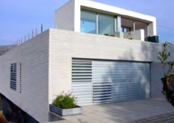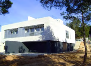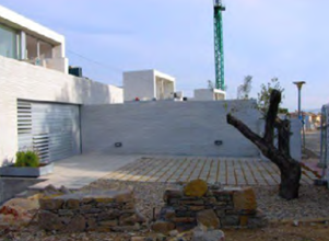 En las fachadas se combina obra vista de color blanco, tipo “Ferrater”, con monocapa de color gris oscuro. La carpintería exterior es de aluminio. Las viviendas disponen, en superficie, de un espacio habilitado para aparcamiento de vehículos.